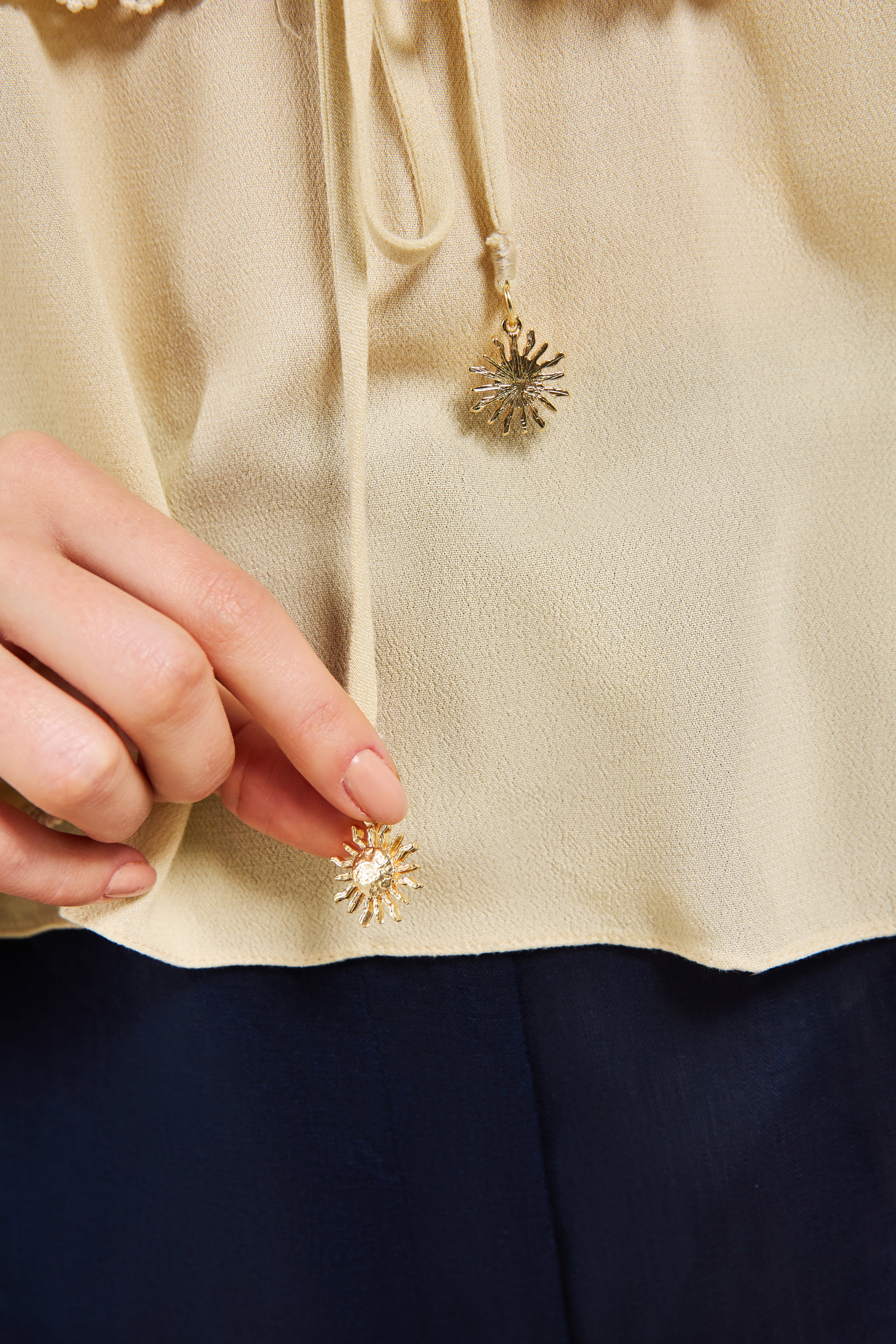 - **Amarração no decote com ponteira delicada**