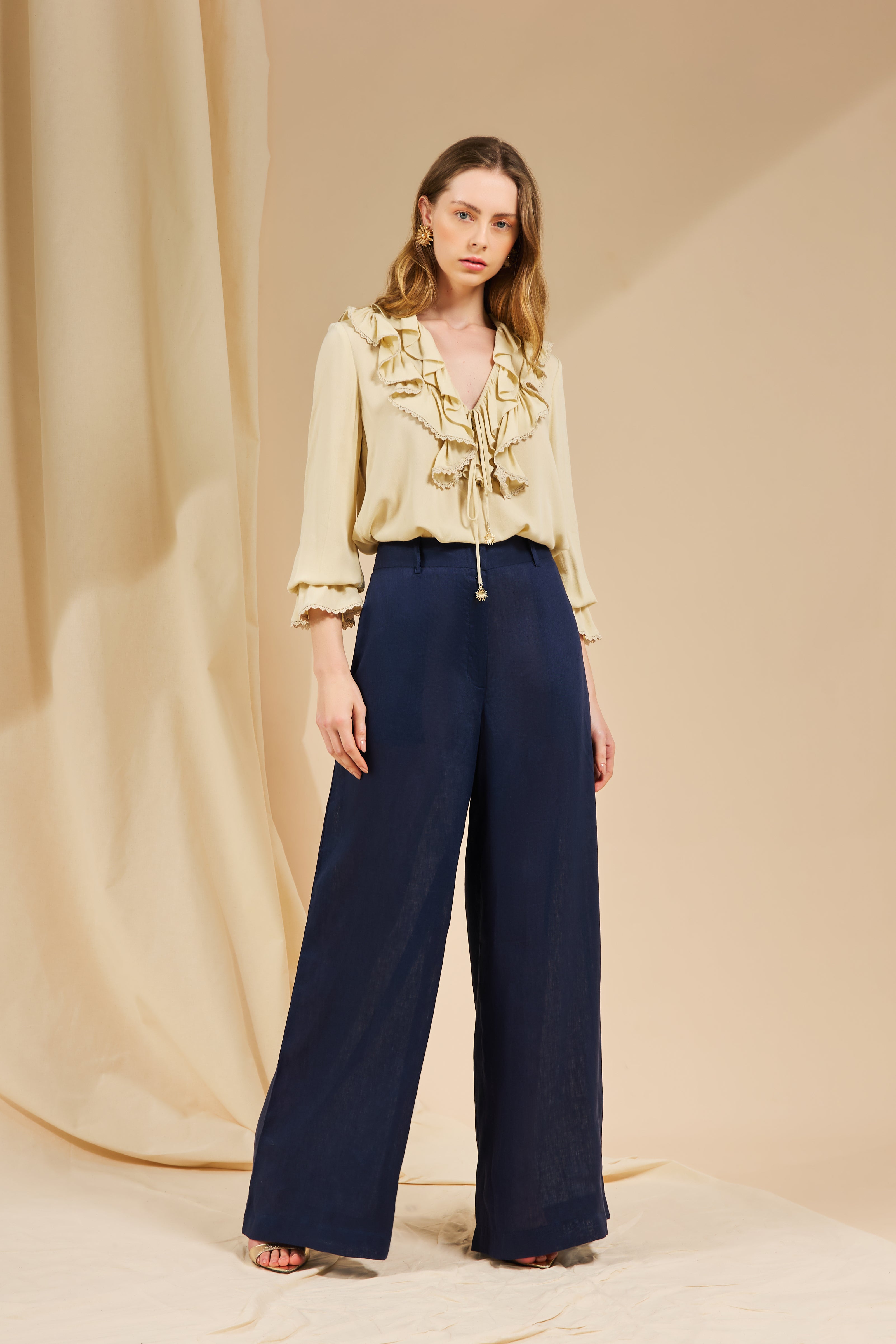 A Blusa Babado Di Mare é confeccionada em 100% viscose, trazendo leveza e fluidez ao vestir. O decote em V com babados adiciona feminilidade e movimento, enquanto a amarração com ponteira delicada dá um toque de charme extra. As mangas longas finalizadas com punho franzido e detalhe em renda reforçam a sofisticação da peça, ideal para produções românticas e atemporais.