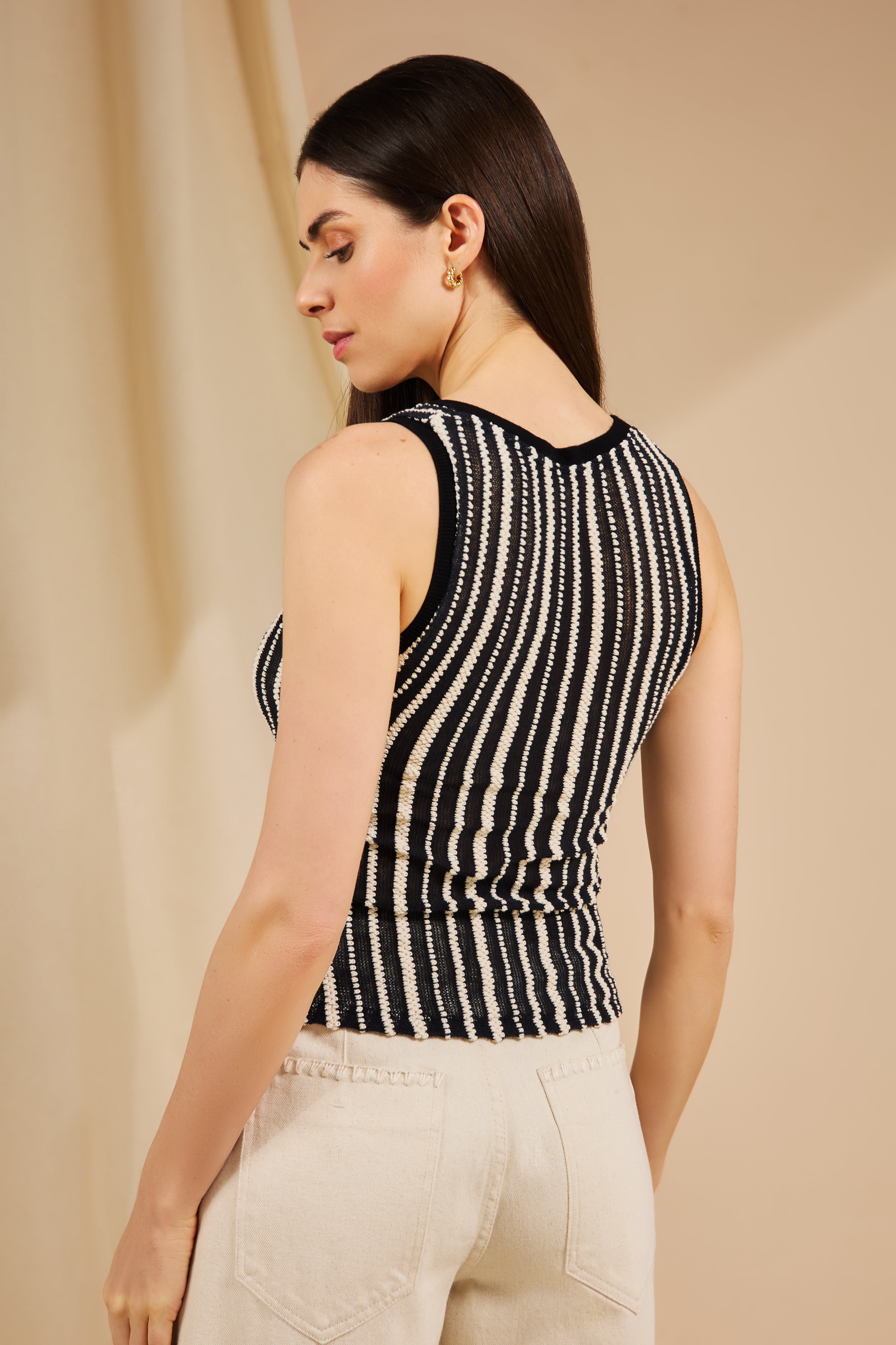A Regata Linea combina conforto e modernidade em uma proposta versátil. Confeccionada em tricot com predominância de algodão, a peça apresenta padronagem listrada que valoriza a silhueta com um visual atemporal e sofisticado. Seu decote redondo e a modelagem reta ajustada ao corpo garantem caimento elegante, enquanto o toque macio do fio acrescenta bem-estar ao uso. Um item essencial para composições que transitam entre o casual refinado e produções de maior impacto.