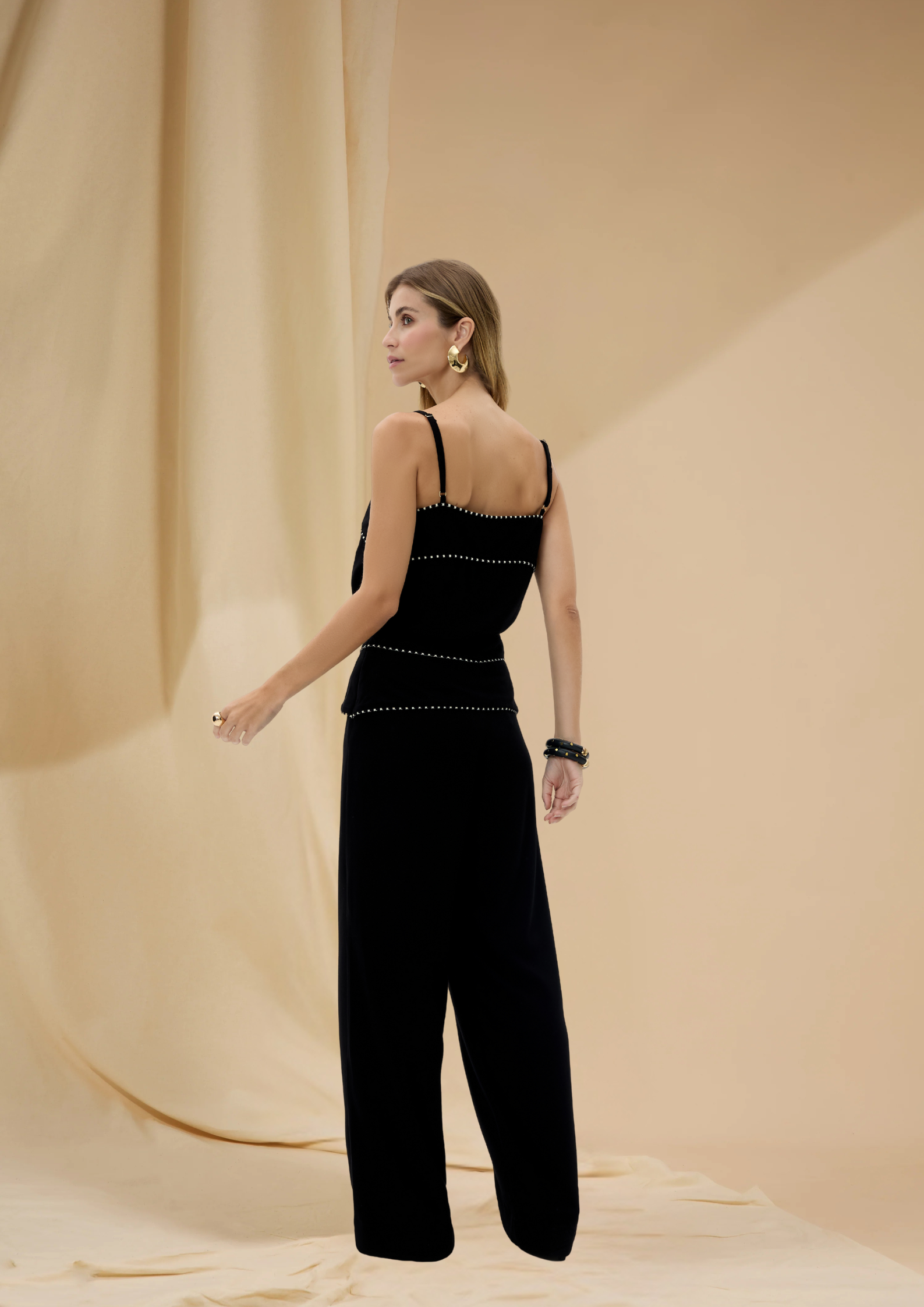 A Calça Gardenia combina elegância e modernidade em uma proposta atemporal. De modelagem reta e cintura alta, valoriza a silhueta com sofisticação. O detalhe em pesponto contrastante percorre o comprimento da peça, criando um desenho vertical que alonga o corpo e confere identidade artesanal. O fechamento lateral por zíper invisível mantém o visual sofisticado e minimalista, enquanto a pala dupla acrescenta um toque refinado ao design.