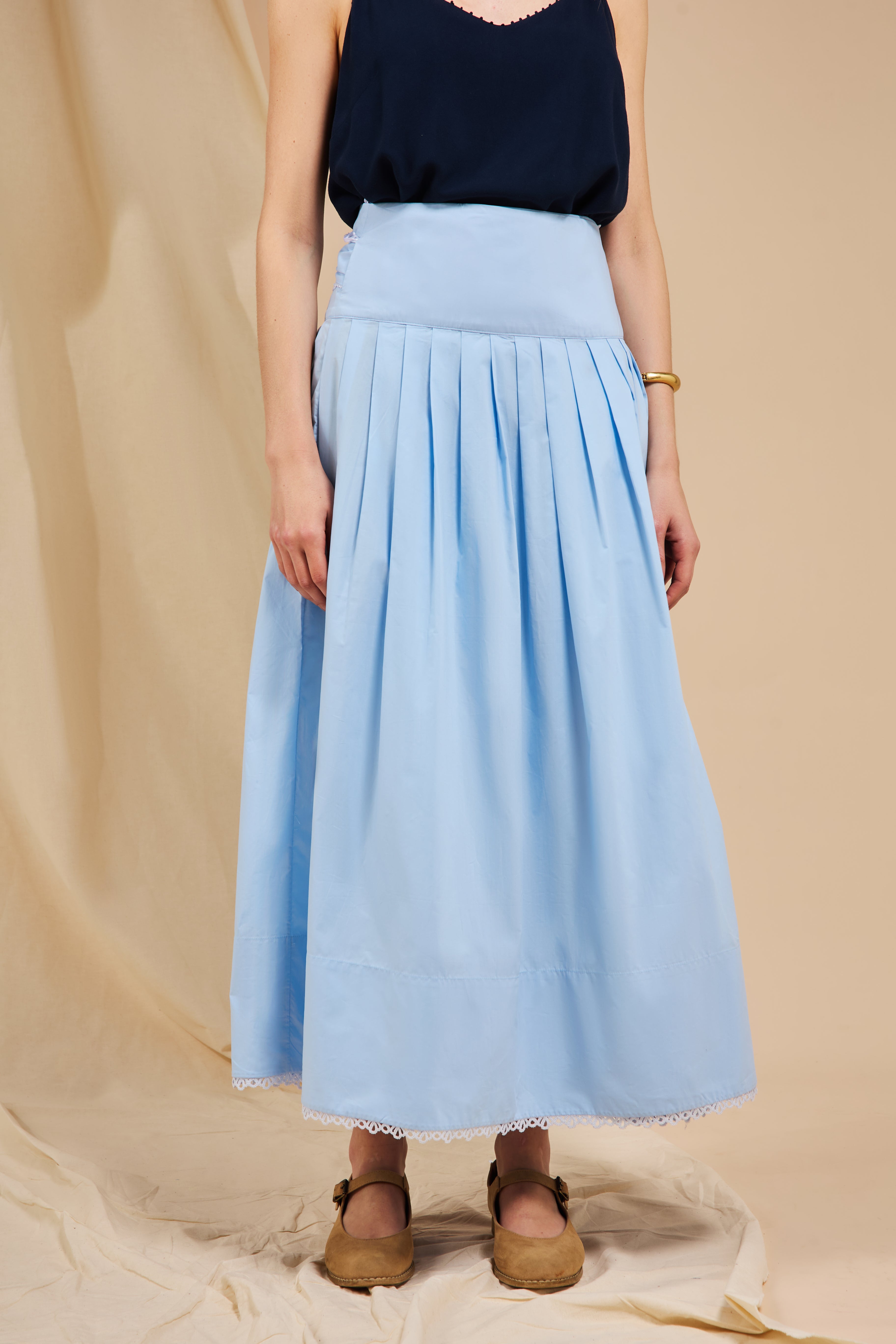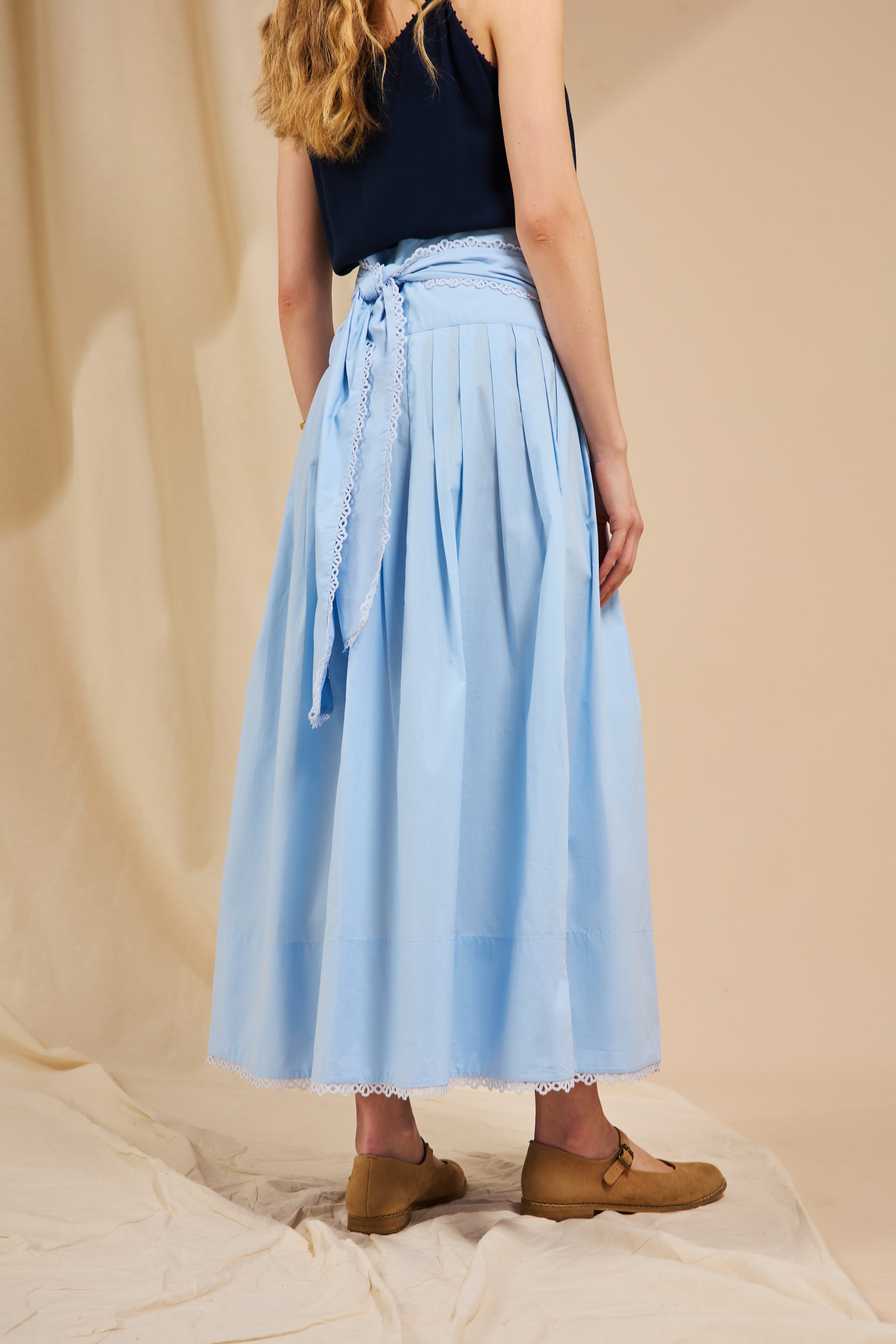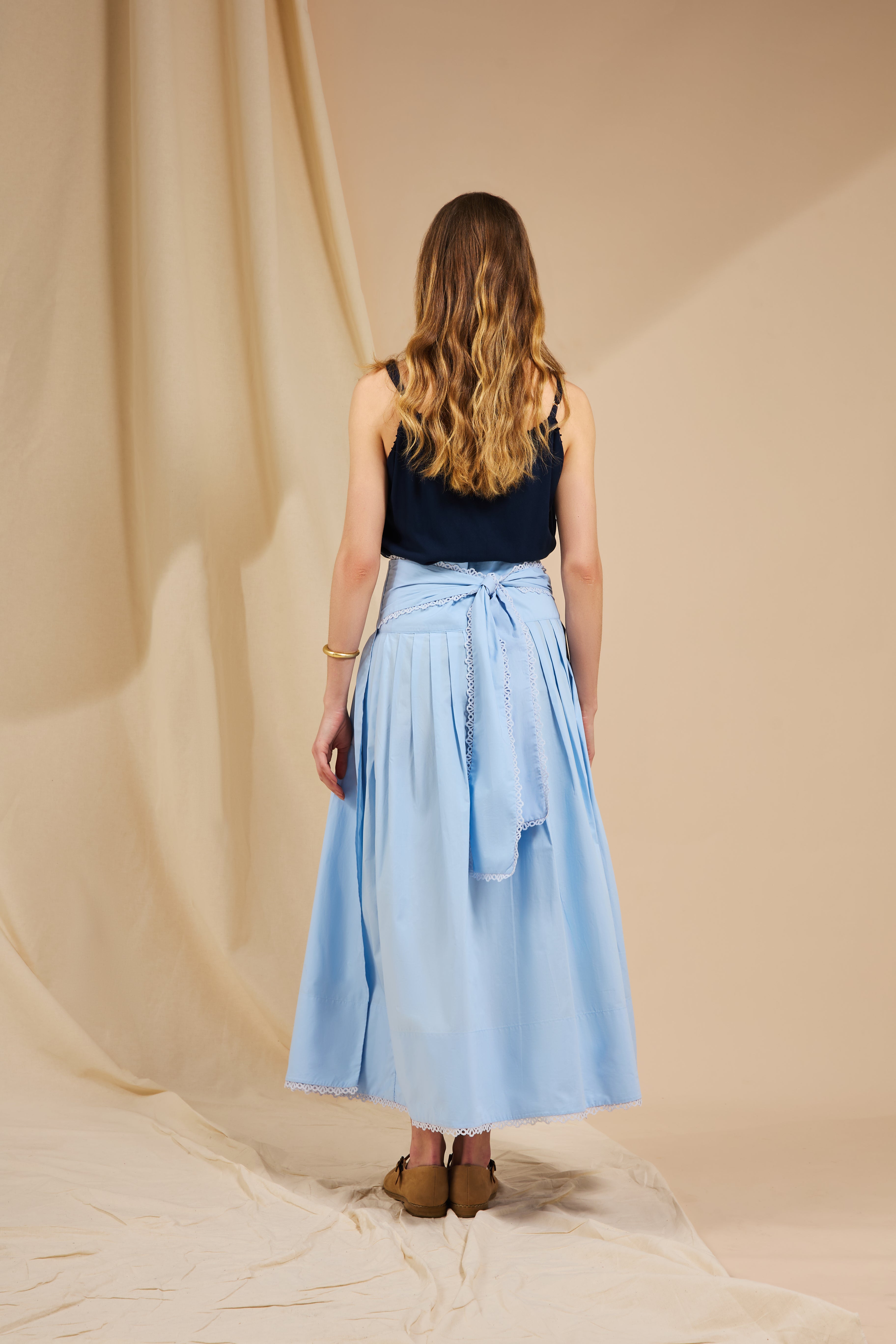 A Saia Petúnia é confeccionada em algodão, unindo leveza e estrutura em uma modelagem pareô, prática e sofisticada. De comprimento midi, valoriza a silhueta com pregas que criam movimento delicado. A faixa permite amarração com charme e fluidez, enquanto o acabamento em bico de algodão, presente tanto na barra quanto nas bordas da faixa, reforça o cuidado nos detalhes. Uma peça versátil e feminina, ideal para composições que unem romantismo e elegância.