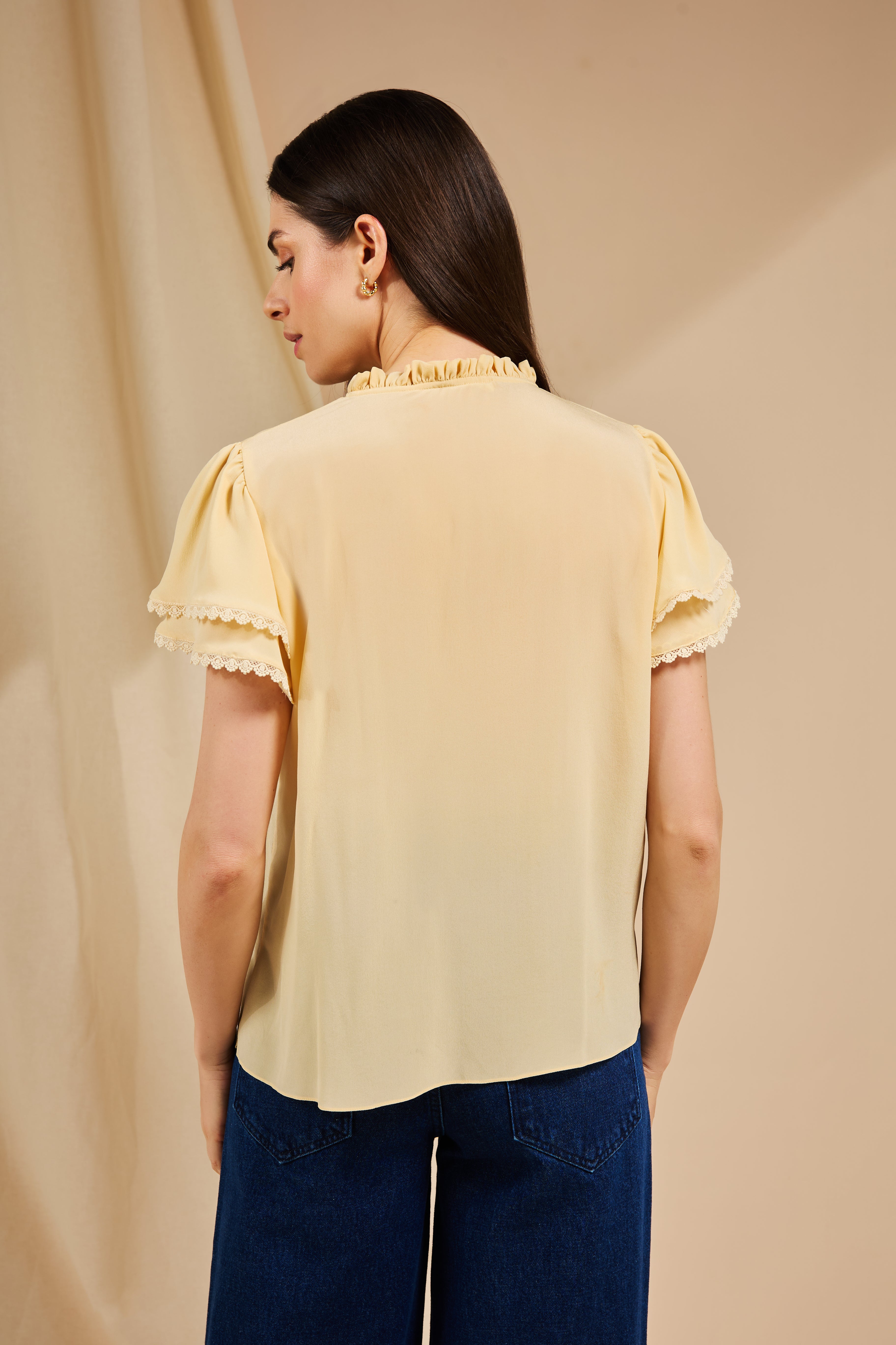A Blusa Babado Miele é confeccionada em seda pura, unindo sofisticação e feminilidade em cada detalhe. O decote em gota com roletê ajustável é finalizado com ponteiras em metal dourado em formato de sol, que trazem um toque especial e luminoso à peça. A gola com babado sutil acrescenta romantismo, enquanto as mangas curtas bufantes ganham charme extra com acabamento em bico de algodão. Uma peça refinada e versátil, perfeita para ocasiões que pedem delicadeza e elegância.