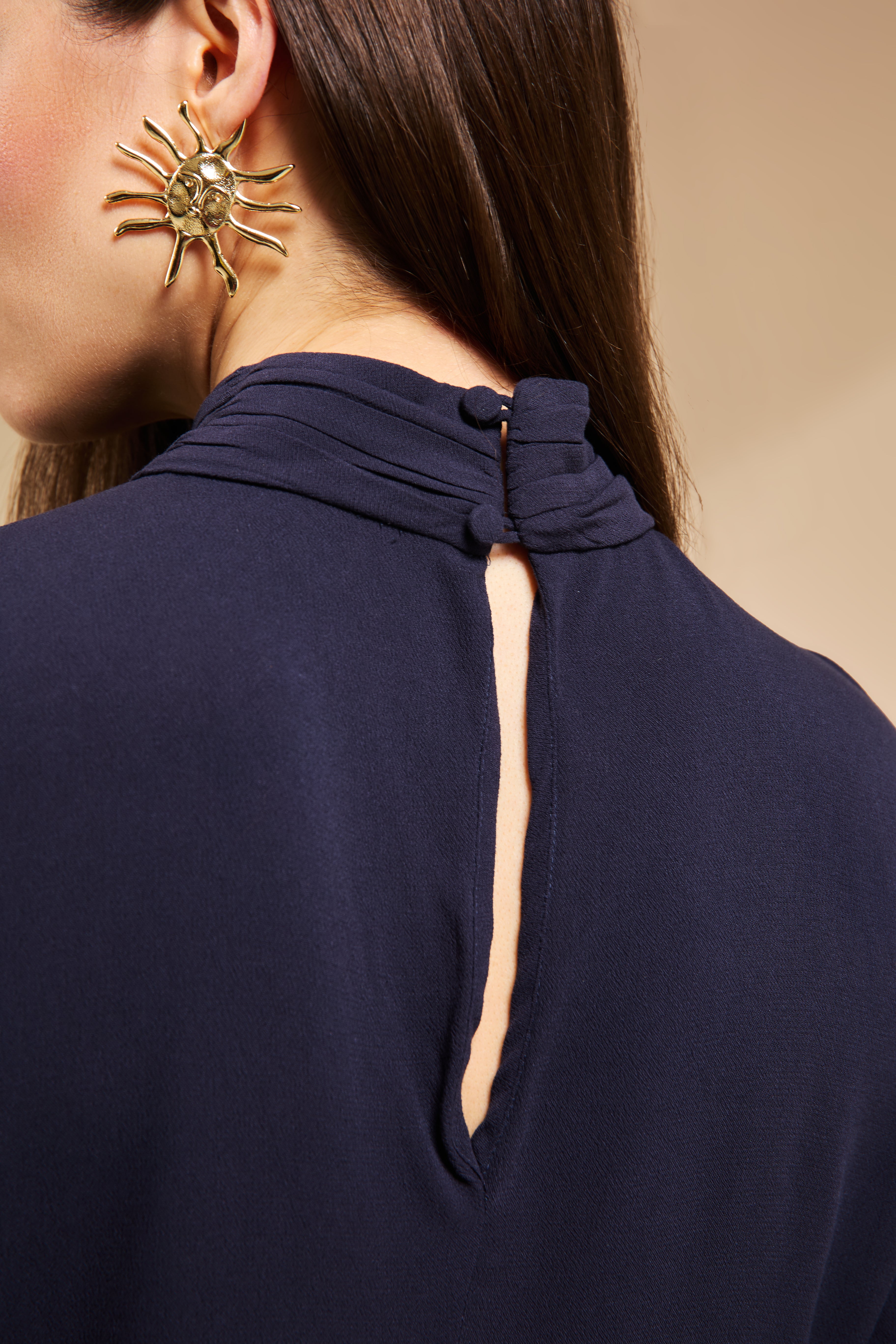 A Blusa Di Mare é confeccionada em viscose leve e fluida, trazendo um caimento elegante e confortável. Sua gola alta drapeada acrescenta sofisticação, enquanto as mangas curtas amplas com franzido no ombro garantem delicadeza e movimento. O detalhe em renda no acabamento das mangas adiciona um toque artesanal, e a abertura posterior com botão assegura praticidade e charme.