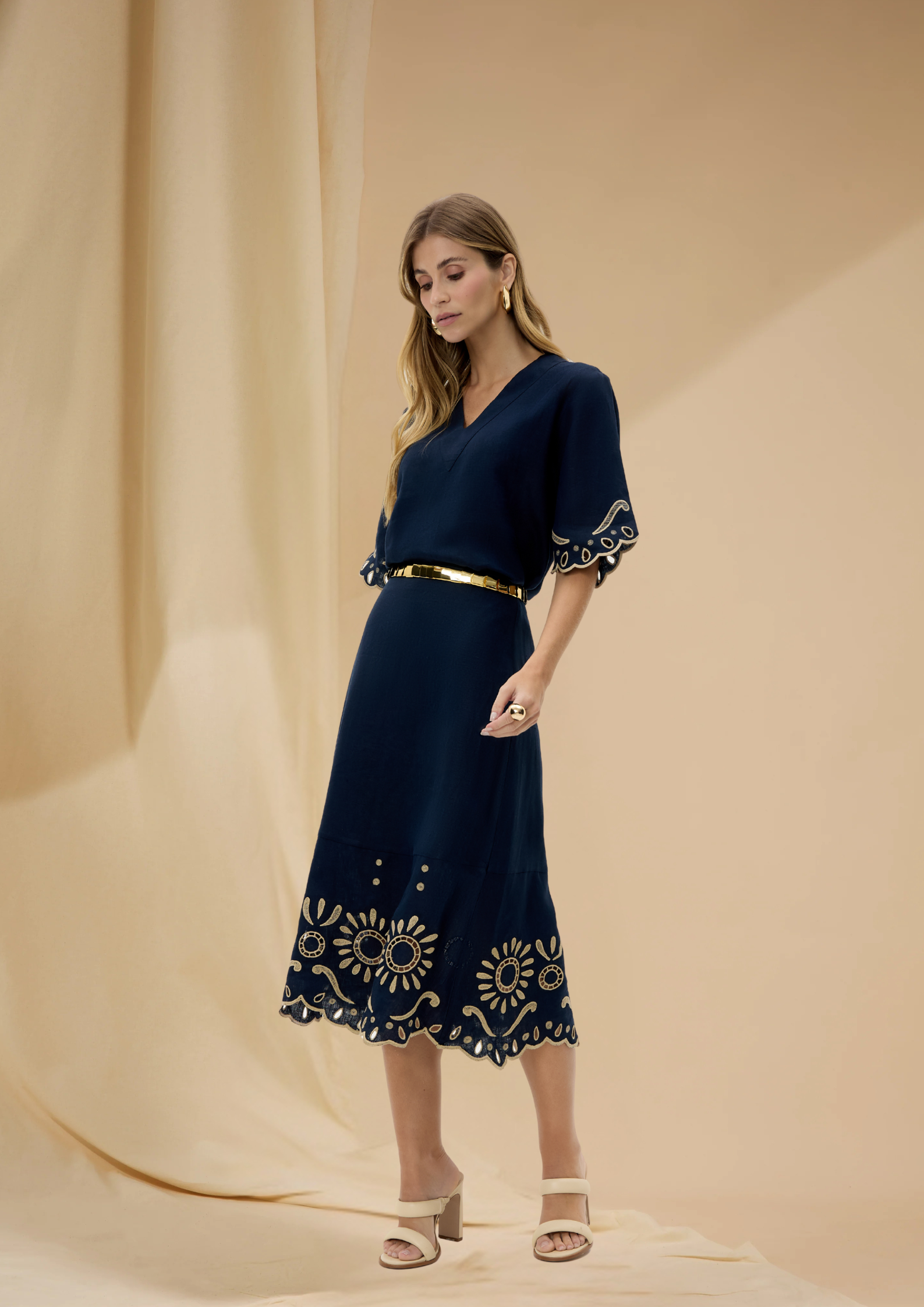 A Saia Fiore é confeccionada em linho puro, valorizando o toque natural e o caimento elegante do tecido. O destaque fica por conta do bordado richelieu aplicado na barra, em desenho floral delicado que reforça o aspecto artesanal da peça. A modelagem reta, com leve abertura na base, equilibra sofisticação e conforto, enquanto o acabamento em ondas confere feminilidade e movimento. Possui forro em algodão para maior conforto e segurança ao vestir.