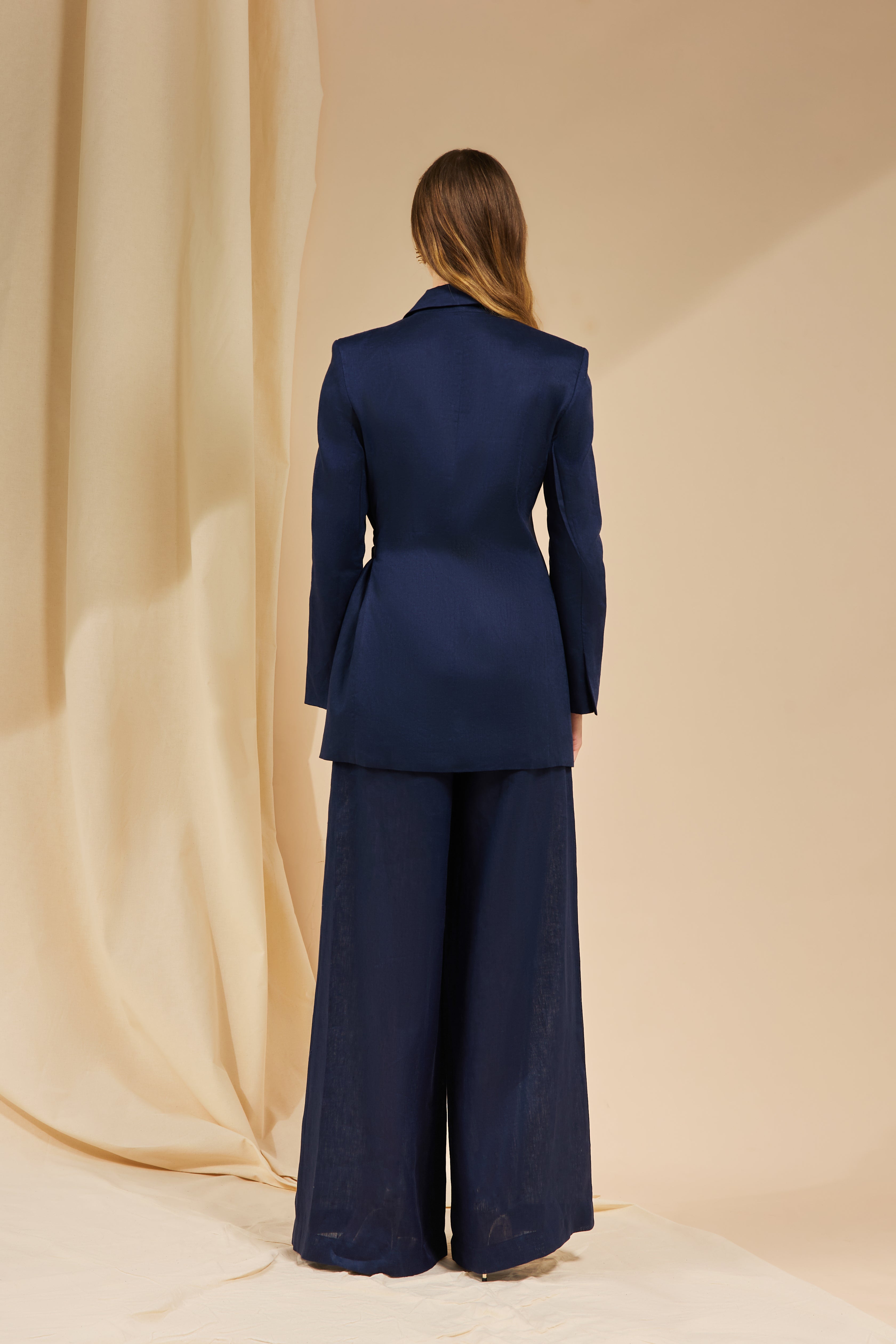 O Blazer Sollene combina a sofisticação da alfaiataria estruturada com um detalhe marcante na cintura: a faixa fixa para amarração, finalizada com aplique de sol. Os bolsos frontais com lapela e o corte preciso reforçam a elegância da peça, tornando-a ideal para produções refinadas e atemporais.