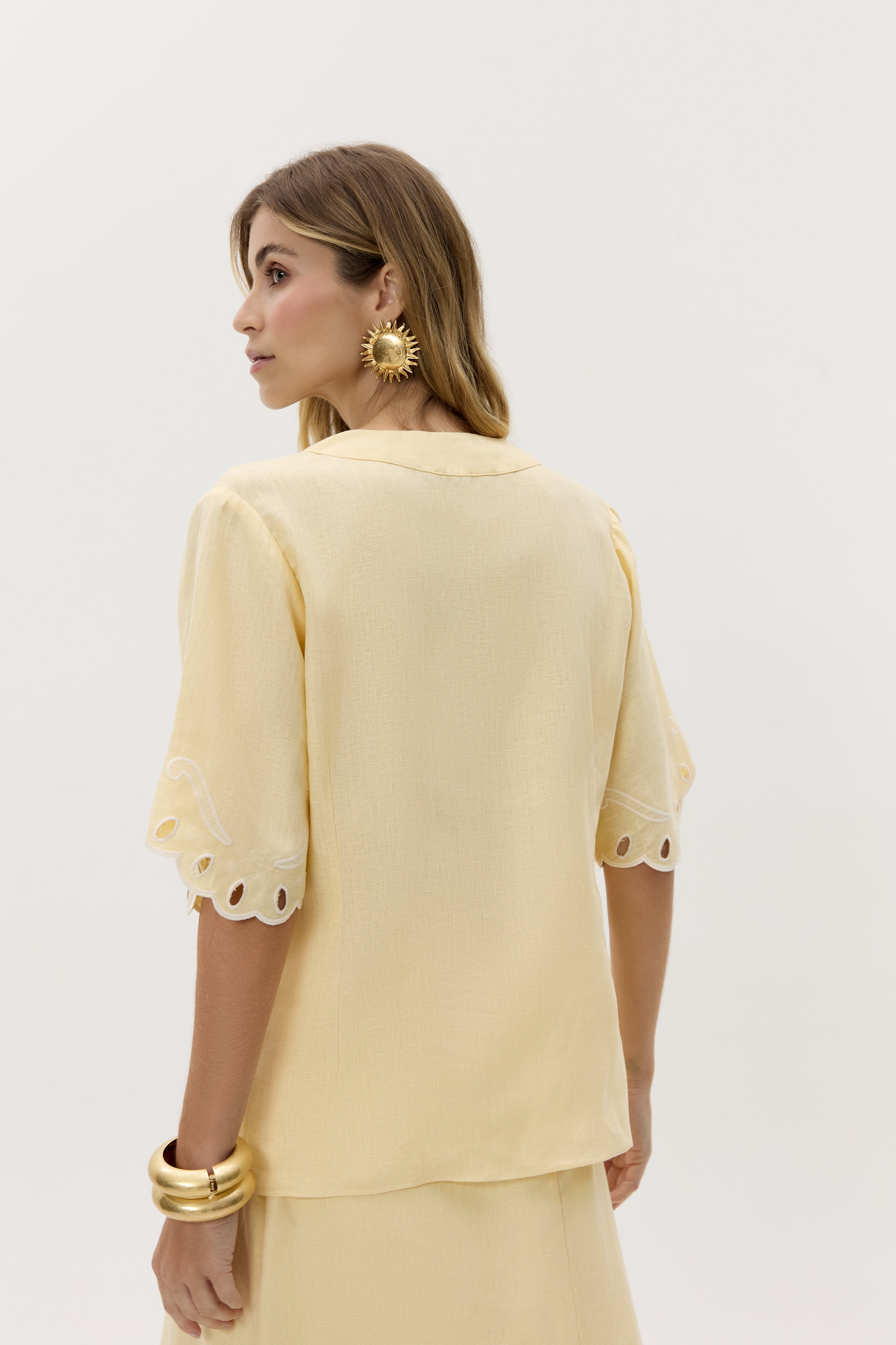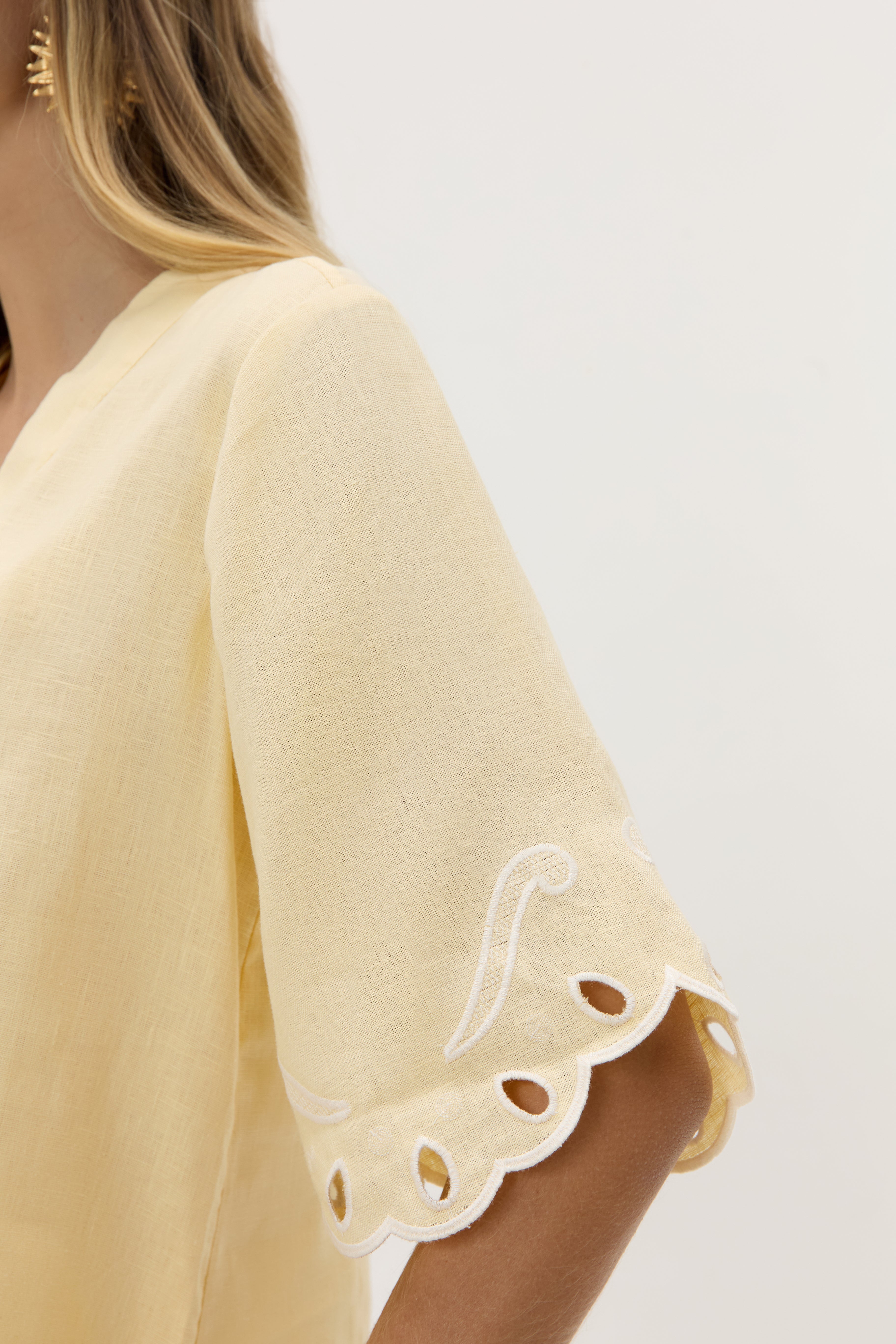A Blusa Fiore é confeccionada em linho puro, destacando o caimento natural e o visual sofisticado do material. O decote em “V” com pala valoriza o colo com elegância, enquanto as mangas amplas ¾ trazem leveza e movimento. O bordado aplicado nas mangas adiciona um toque artesanal e refinado, traduzindo o cuidado característico das peças