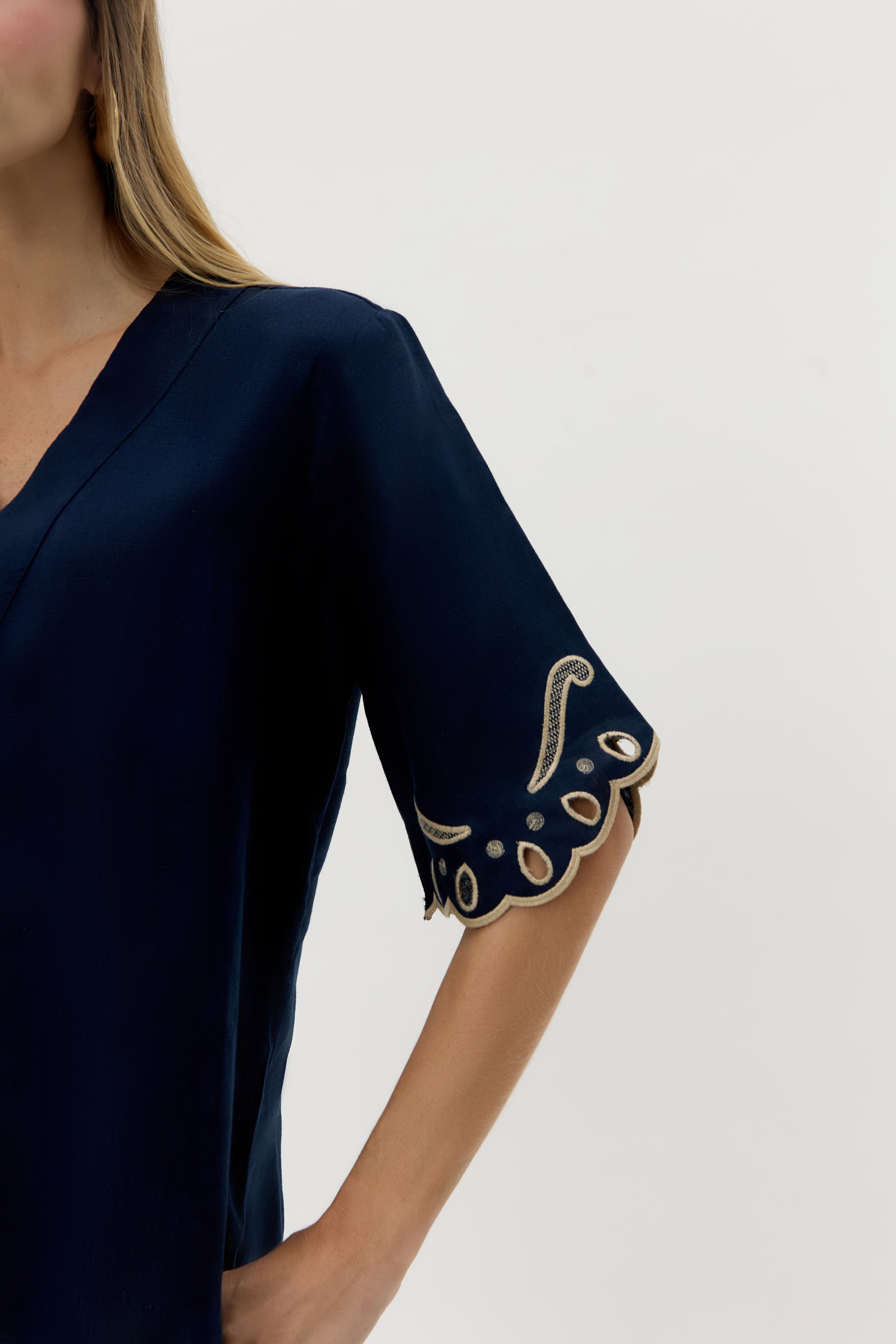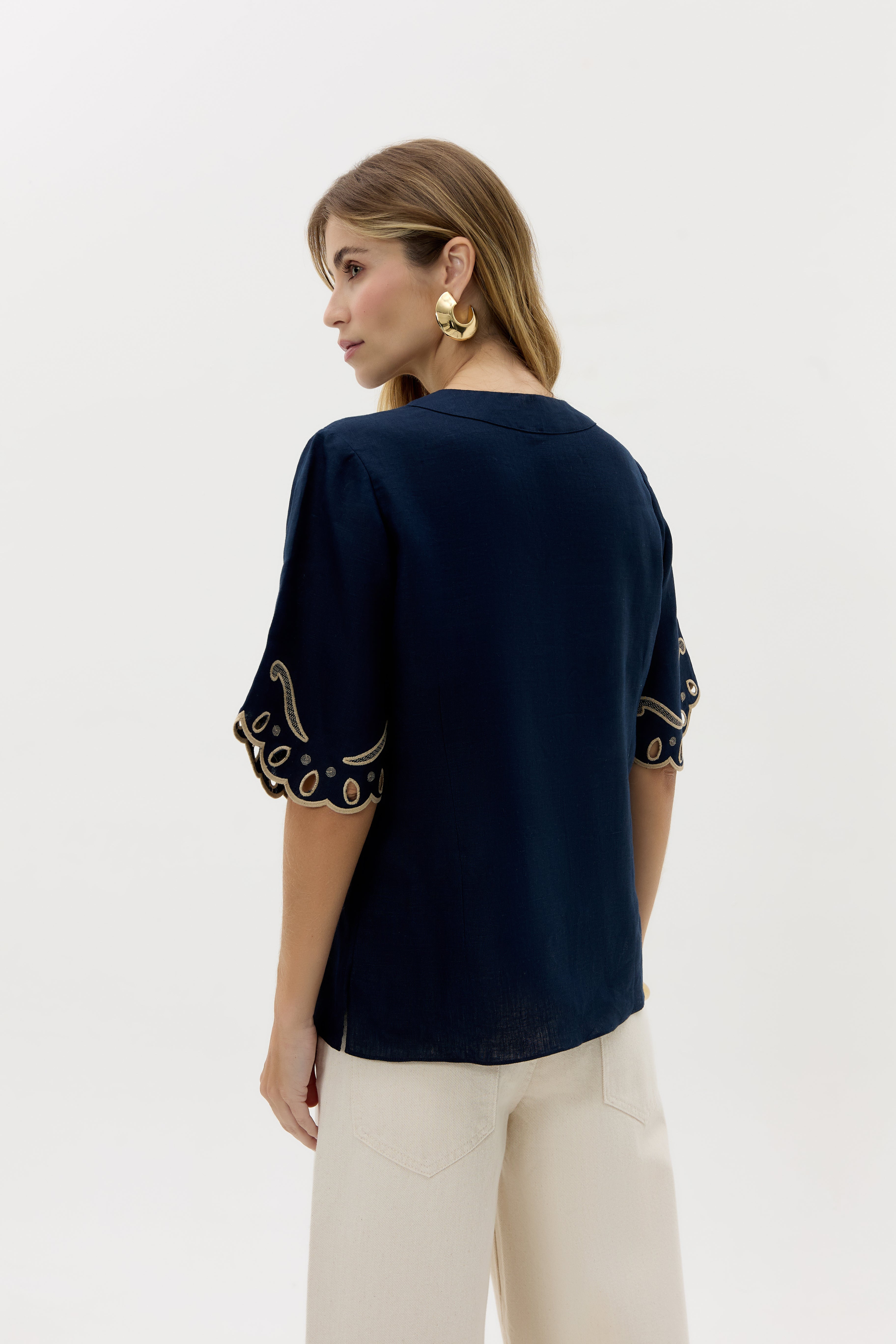 A Blusa Fiore é confeccionada em linho puro, destacando o caimento natural e o visual sofisticado do material. O decote em “V” com pala valoriza o colo com elegância, enquanto as mangas amplas ¾ trazem leveza e movimento. O bordado aplicado nas mangas adiciona um toque artesanal e refinado, traduzindo o cuidado característico das peças