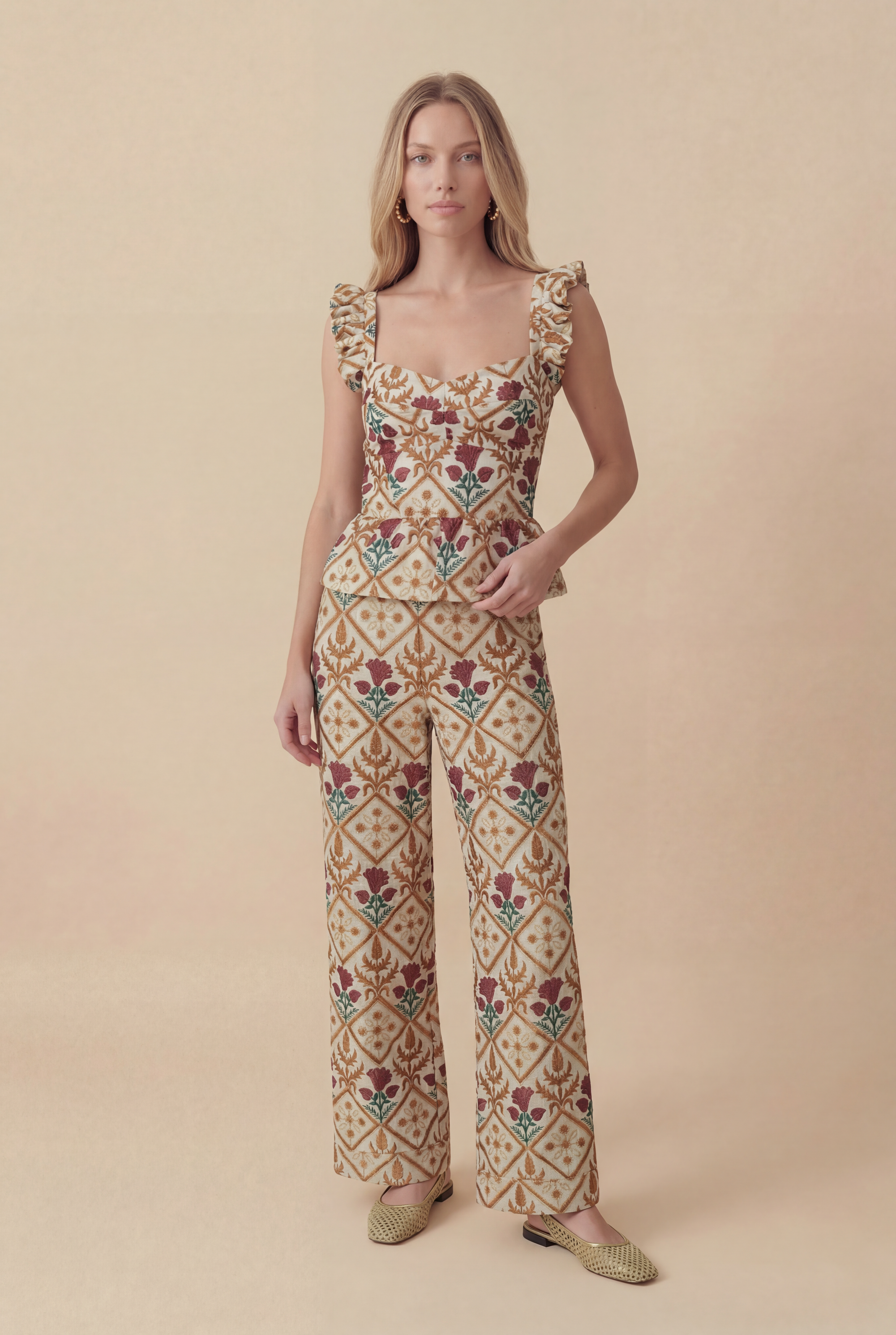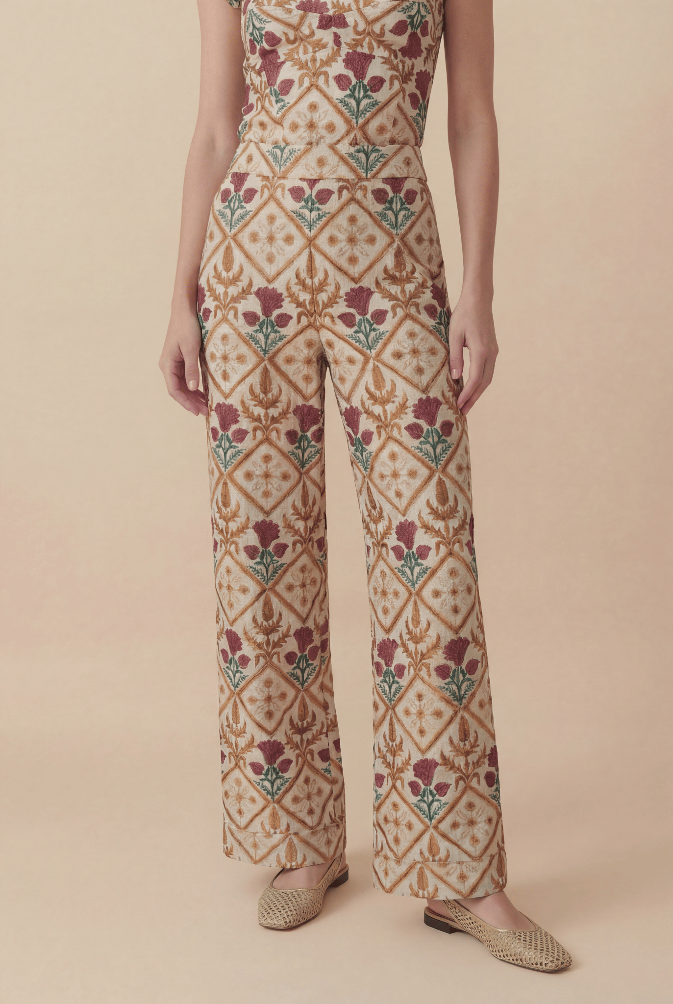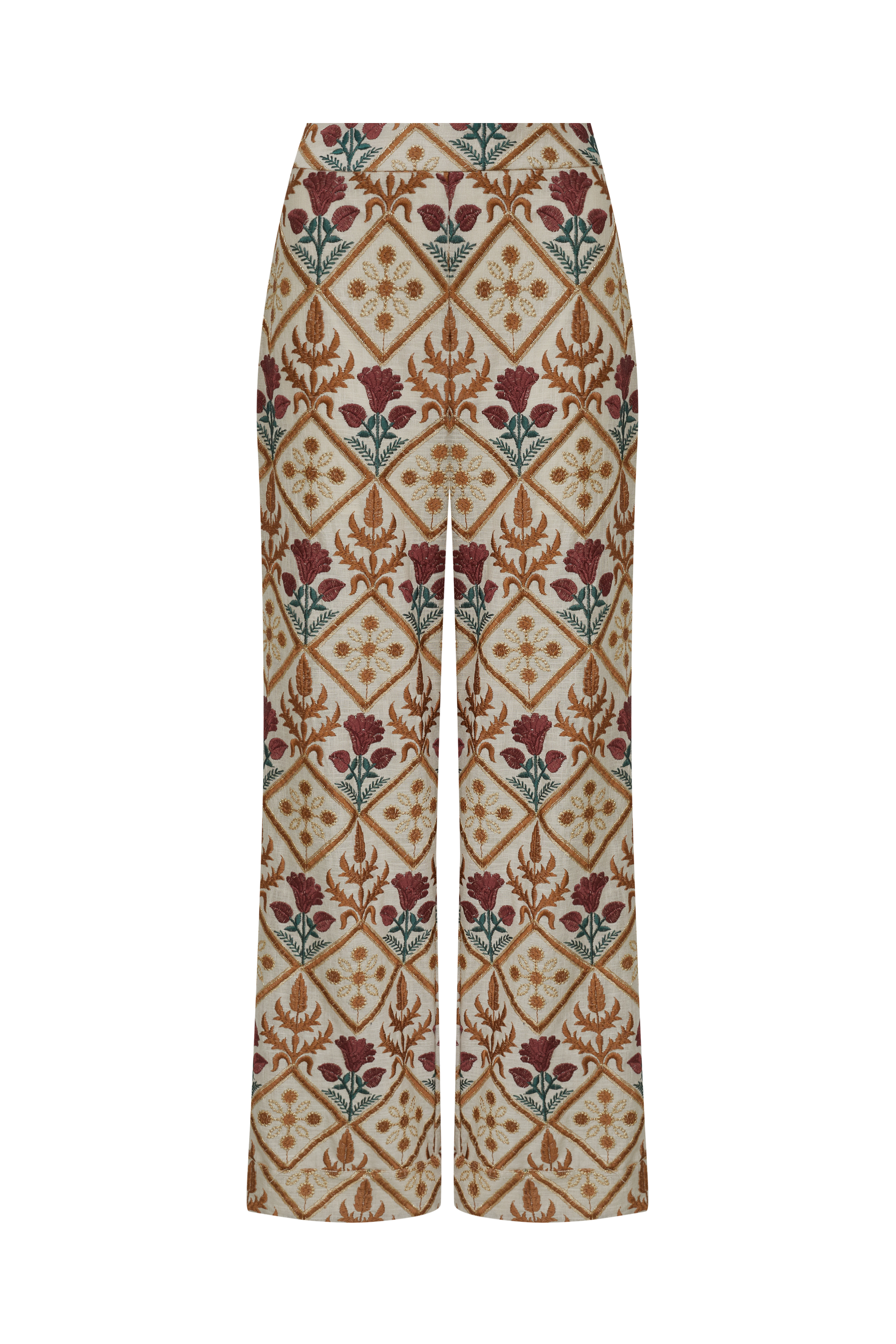 A Calça Herbário traduz a riqueza botânica da coleção em uma peça marcante e sofisticada. Confeccionada em tecido inteiramente bordado com desenhos florais e arabescos que remetem a um herbário ornamental, apresenta modelagem reta com caimento elegante que alonga a silhueta e valoriza o movimento da peça. O cós estruturado garante ajuste confortável à cintura, enquanto a padronagem bordada cria textura e profundidade visual que elevam a composição. Para maior conforto e segurança ao vestir, a peça acompanha short de forro em algodão, preservando o conforto e a segurança de quem usa. Versátil e cheia de personalidade, é ideal para composições elegantes que refletem a estética autoral e atemporal da Nay.
