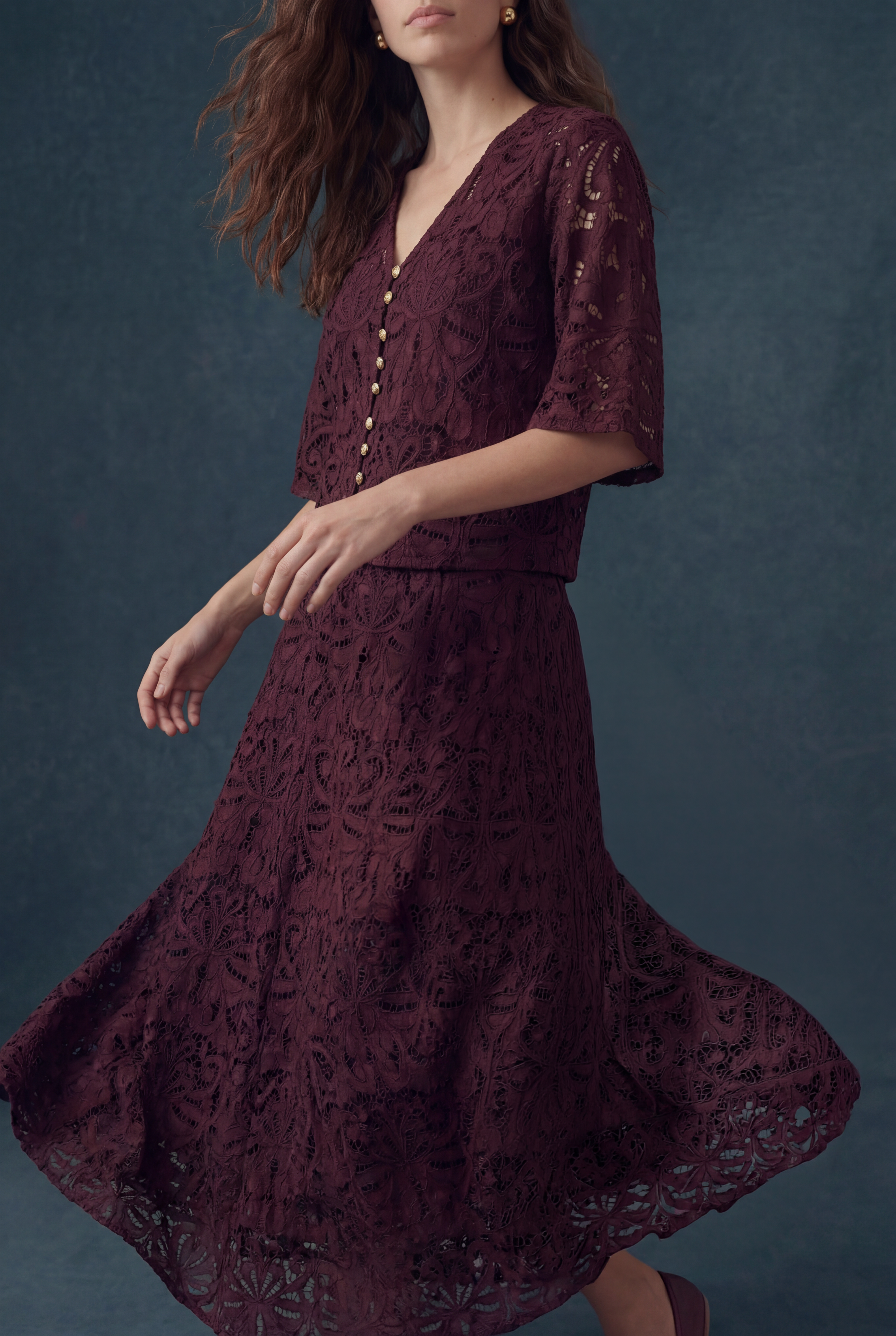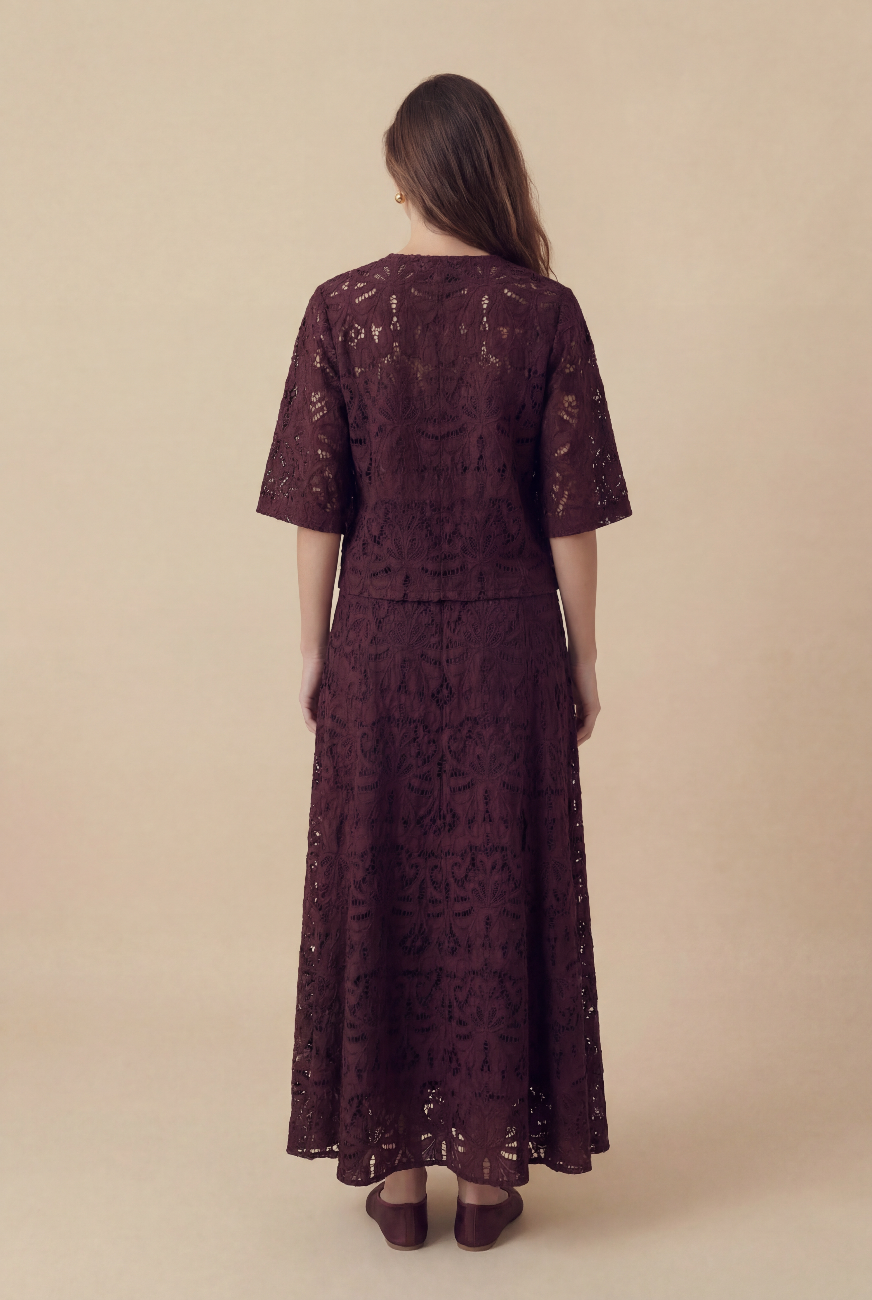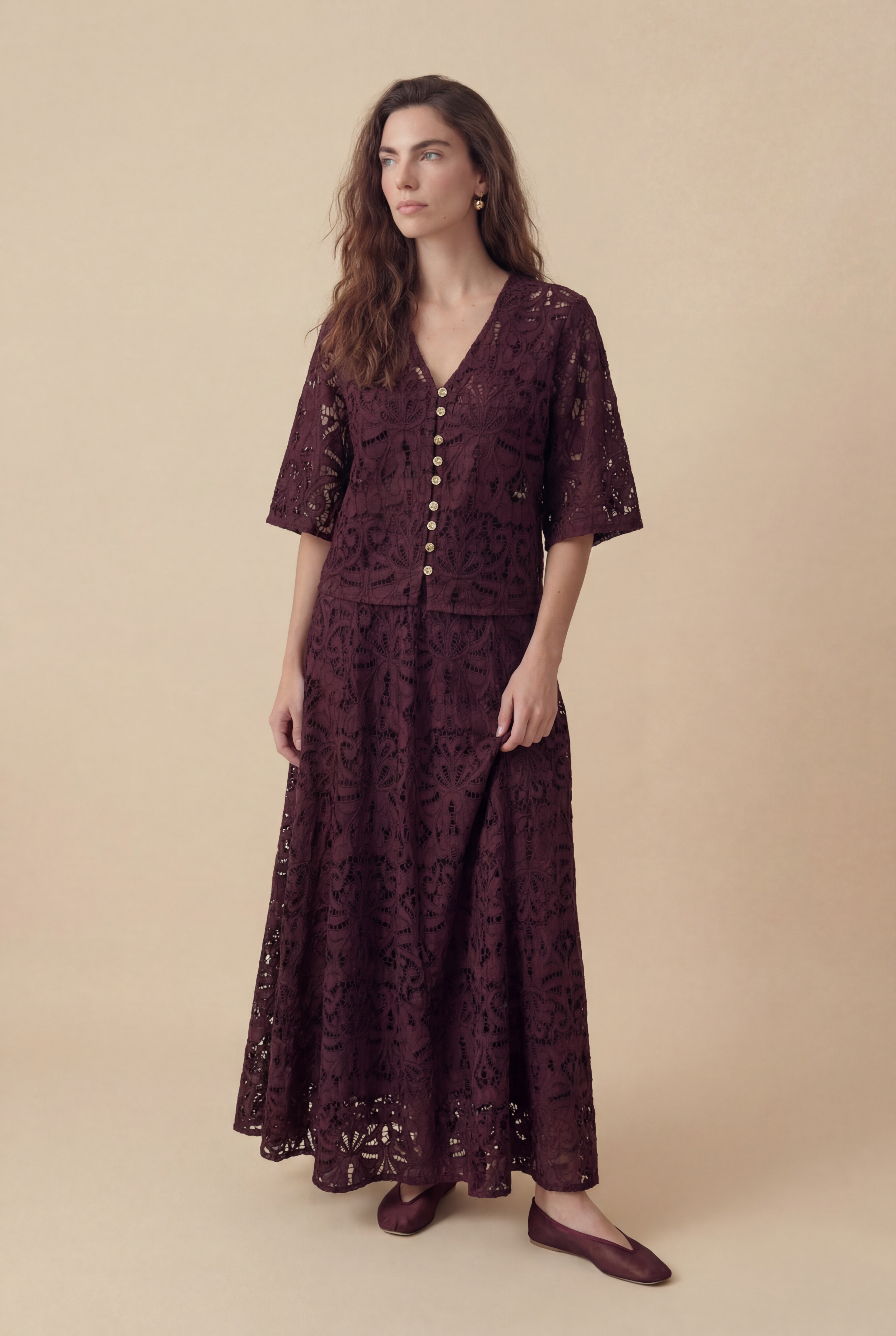 A Saia Naya traduz a elegância da renda em uma silhueta fluida e marcante. Confeccionada em tecido trabalhado com base de algodão, destaca-se pelos desenhos vazados que revelam riqueza de detalhes e textura sofisticada. Sua modelagem longa e levemente evasê cria movimento natural ao caminhar, enquanto a cintura marcada valoriza a silhueta com equilíbrio. O fechamento com zíper invisível nas costas garante acabamento limpo e discreto. A transparência sutil da renda é acompanhada por forro em algodão, assegurando conforto e segurança ao vestir.