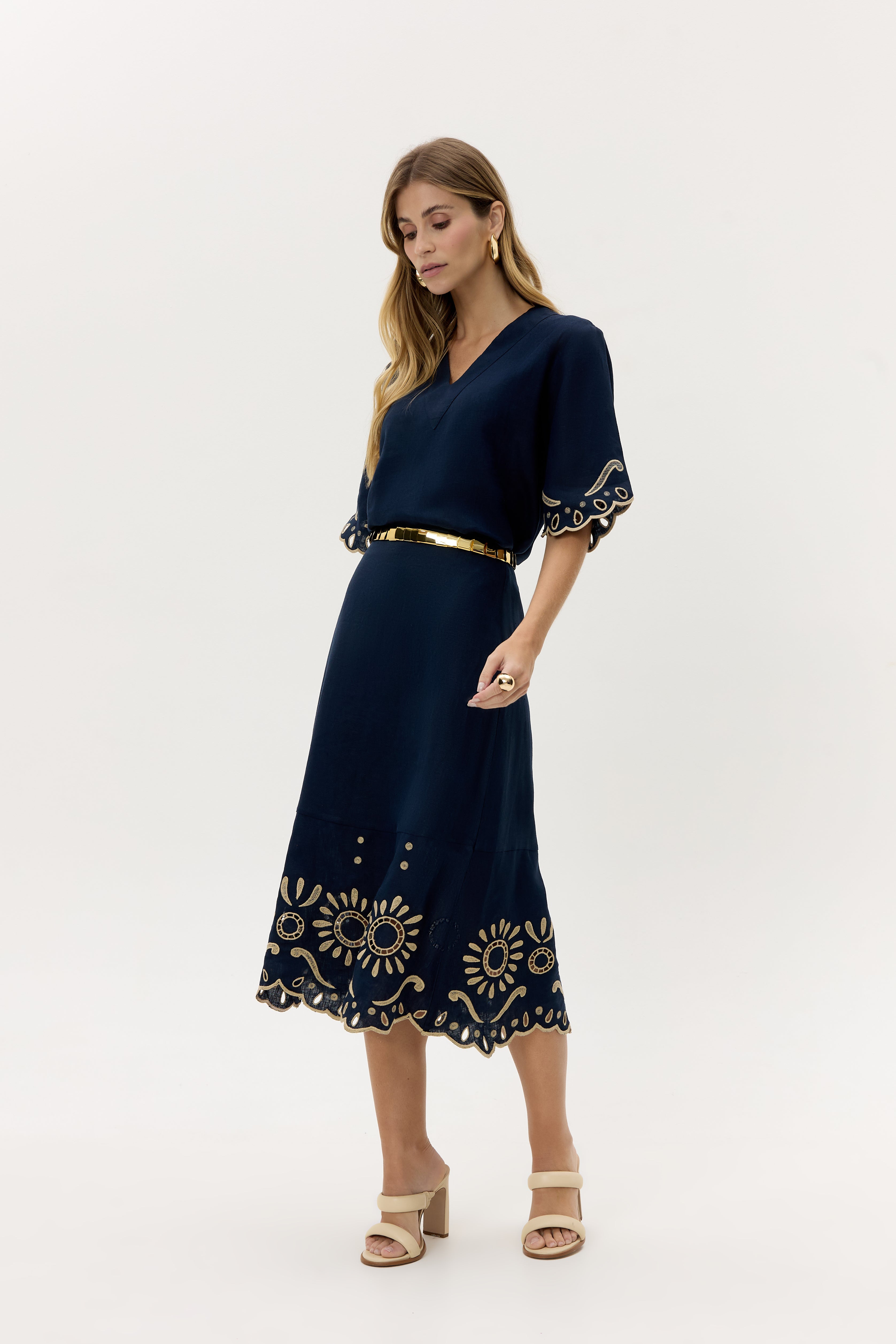 A Saia Fiore é confeccionada em linho puro, valorizando o toque natural e o caimento elegante do tecido. O destaque fica por conta do bordado richelieu aplicado na barra, em desenho floral delicado que reforça o aspecto artesanal da peça. A modelagem reta, com leve abertura na base, equilibra sofisticação e conforto, enquanto o acabamento em ondas confere feminilidade e movimento. Possui forro em algodão para maior conforto e segurança ao vestir.