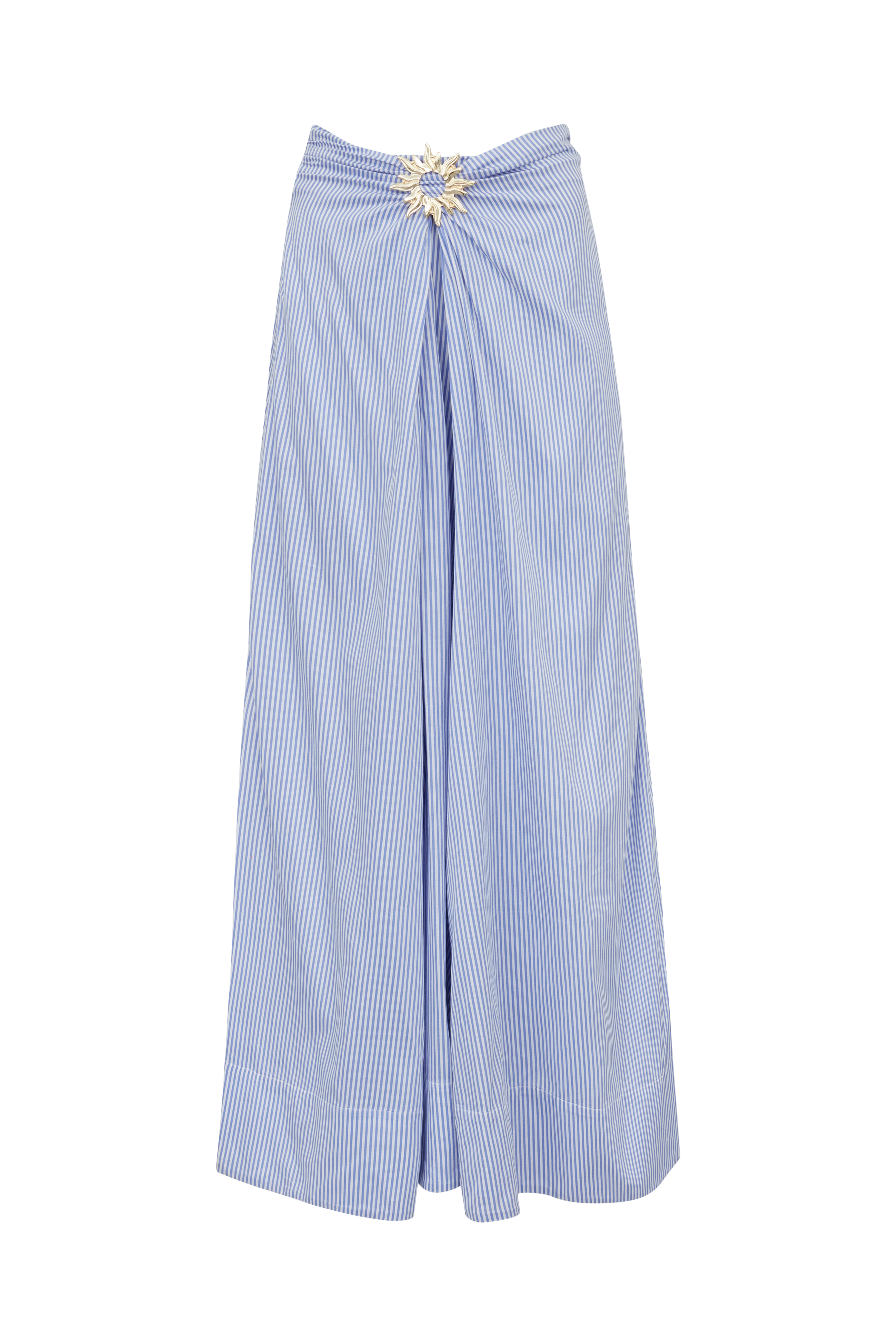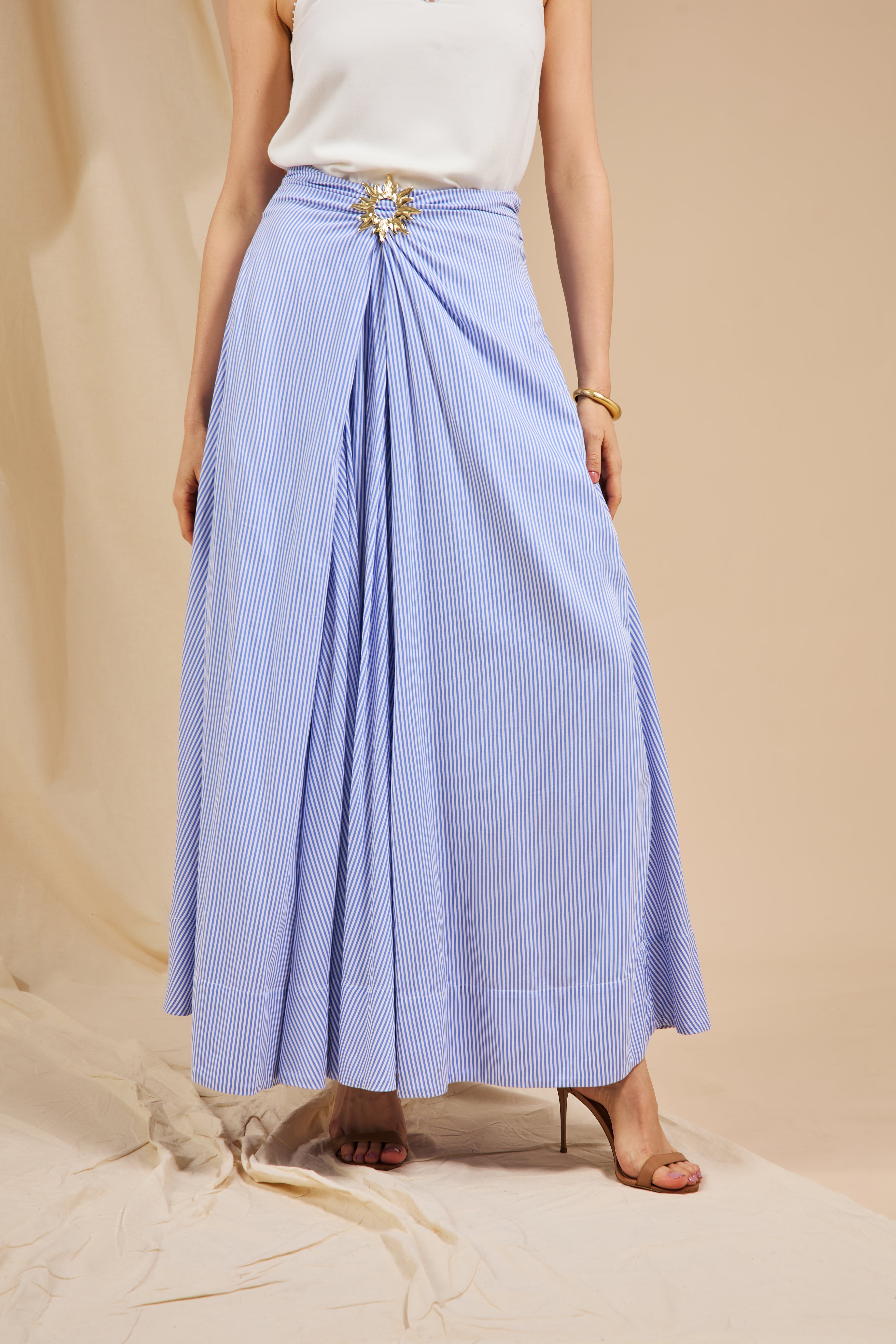 A Saia Solare é confeccionada em algodão leve e fresco, traduzindo o equilíbrio entre elegância e naturalidade. Sua modelagem ampla garante movimento fluido, enquanto o drapeado frontal valoriza a silhueta com delicadeza. O fechamento por zíper invisível e lastex nas costas proporciona conforto e ajuste perfeito ao corpo. O destaque fica por conta do aplique de sol em metal dourado, símbolo do brilho e da energia solar que inspiram a coleção.