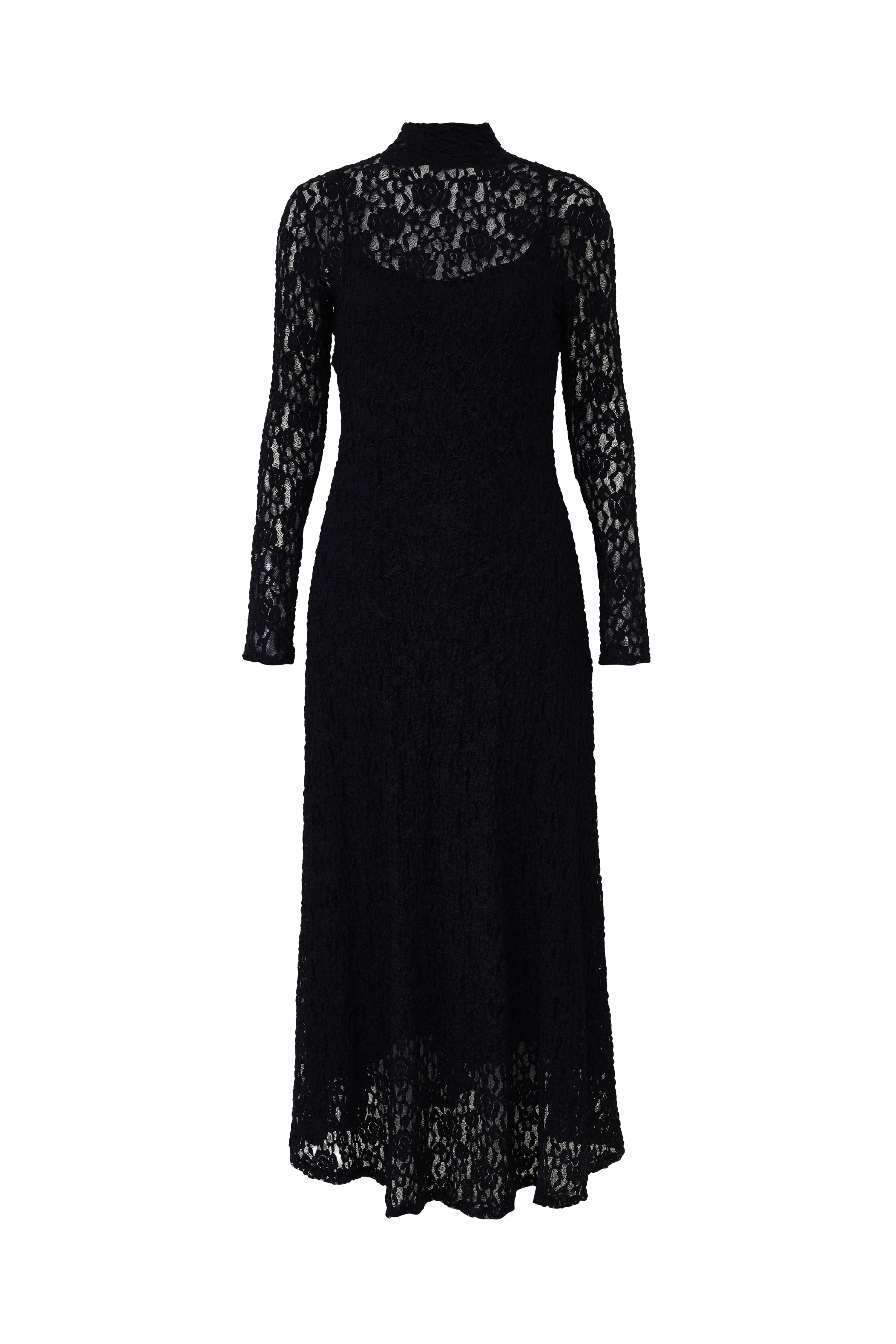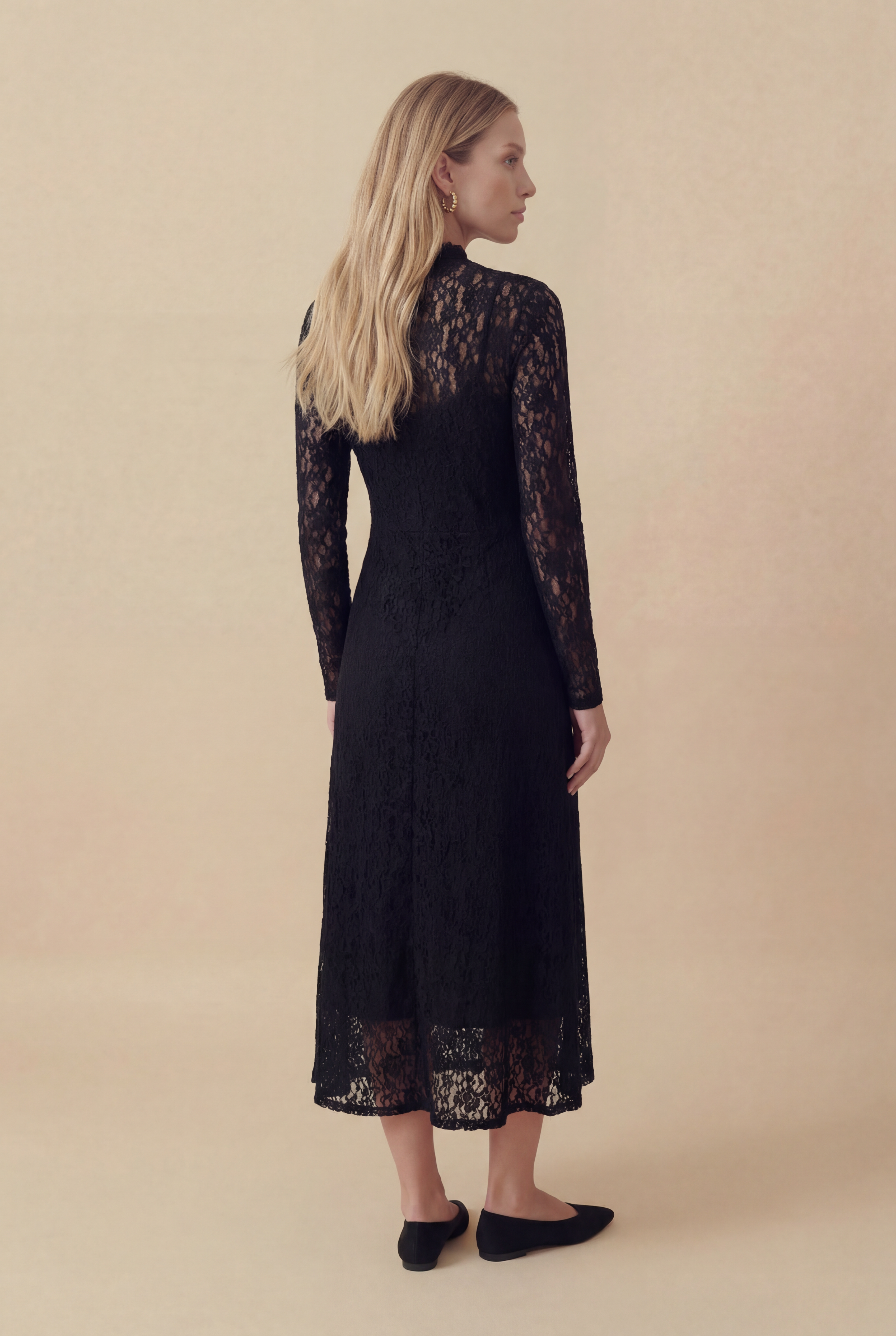 O Vestido Névoa traduz elegância e delicadeza em uma silhueta sofisticada e atemporal. Confeccionado em renda de desenho floral com transparência sutil, envolve o corpo com leveza e cria um efeito visual delicado que valoriza a textura da peça. A modelagem longa acompanha a silhueta com fluidez, enquanto as mangas longas e a gola alta reforçam o caráter refinado do design. Nas costas, a abertura com pequeno botão adiciona um detalhe elegante ao acabamento. A peça acompanha anágua em viscose, garantindo conforto e segurança ao vestir, ao mesmo tempo em que preserva a beleza da renda.