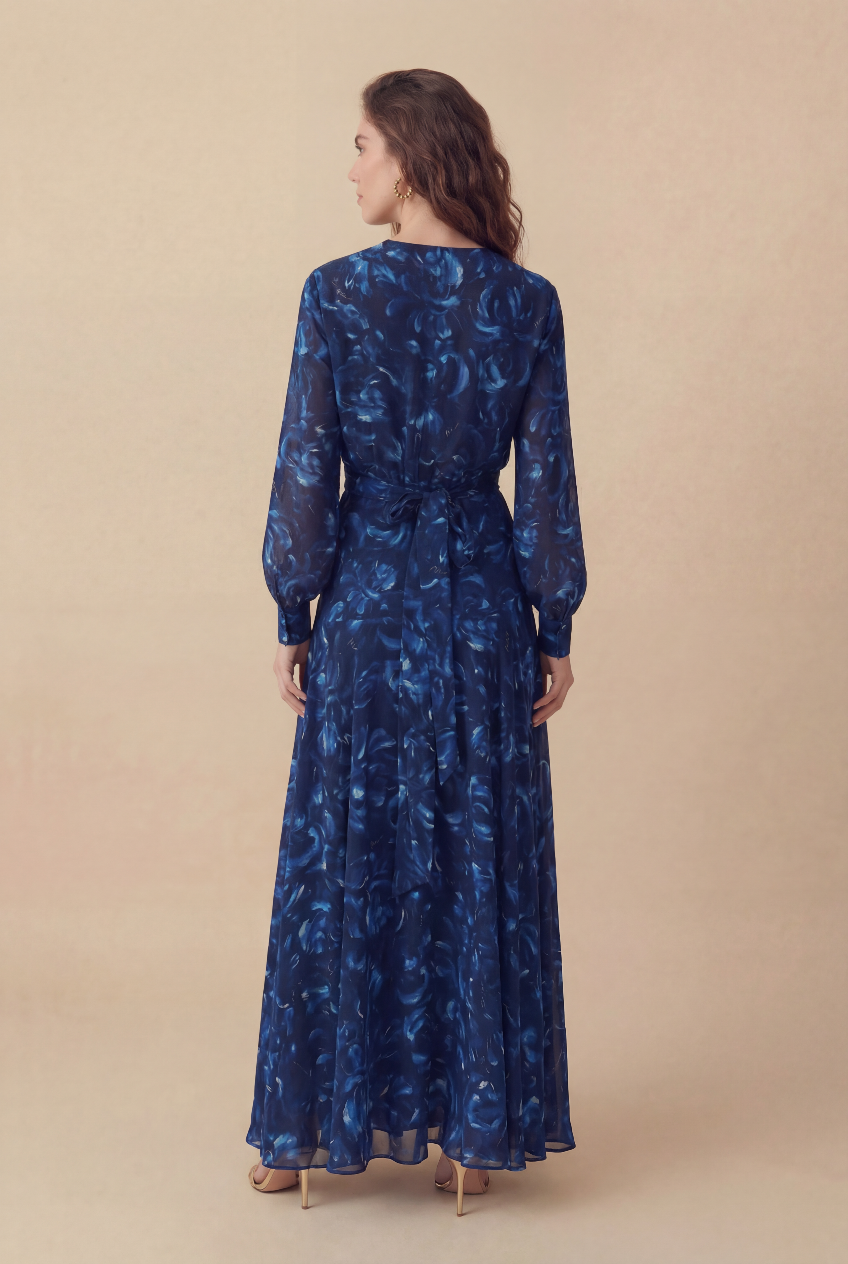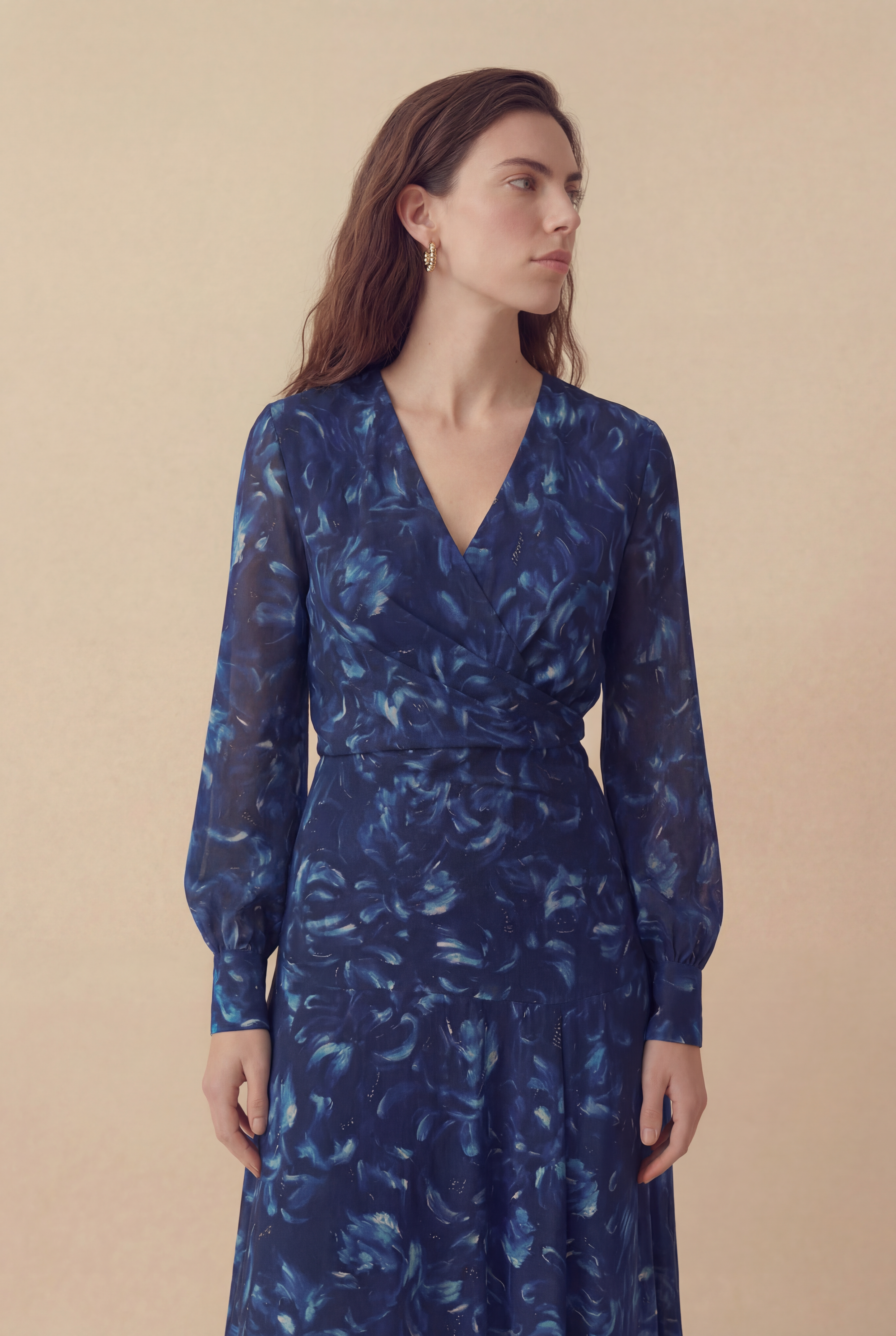 O Vestido Pinceladas traduz a delicadeza do movimento em forma de estampa. Confeccionado em viscose, traz um desenho fluido que remete a pinceladas artísticas em tons profundos de azul, criando uma estética sofisticada e autoral. Sua modelagem longa valoriza a silhueta com leveza, enquanto o decote em V e as mangas longas equilibram elegância e conforto. A saia com recortes sutis acrescenta movimento ao visual, tornando a peça ideal para ocasiões que pedem presença marcante com suavidade.